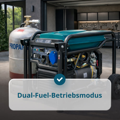 • Hohe Leistung von 6,5 kW (maximal) und 6,0 kW (nominell) im Benzinbetrieb ermöglicht die zuverlässige Versorgung mit energieintensiven Geräten und sorgt für eine stabile Stromversorgung. Bei Betrieb mit Gas sinkt die Leistung nur um 10%, was eine effektive Generatornutzung mit minimalem Leistungsverlust garantiert.