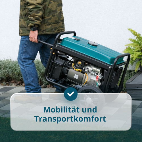 • Mobilität und einfache Handhabung — Räder und Griffe ermöglichen es, den Generator problemlos ohne körperliche Anstrengung zu bewegen.