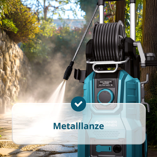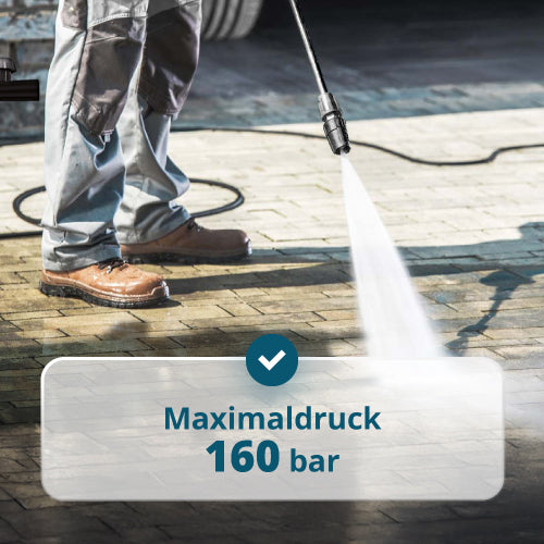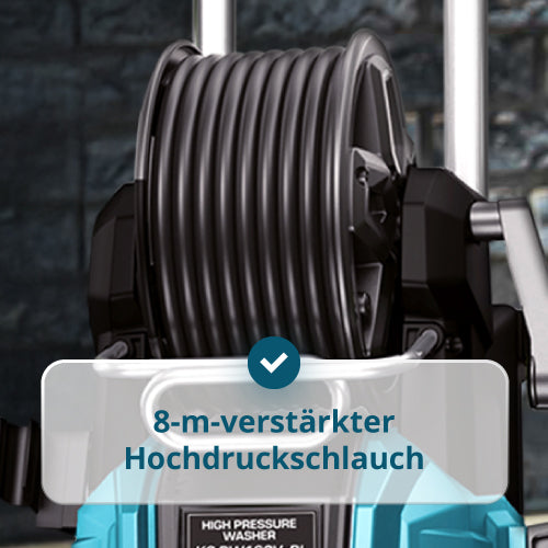 • Verstärkter 8-m-Schlauch – besonders robust und flexibel – hält selbst hohen Druck- und Zugbelastungen stand