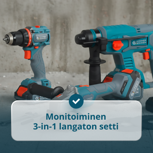 • Monitoiminen johdoton 3-in-1-setti kätevässä laukussa – kolme työkalua yhdessä paketissa: porakone, kulmahiomakone ja poravasara, mukana 2 akkua ja pikalaturi kätevässä laukussa erilaisiin kotitaloustehtäviin.