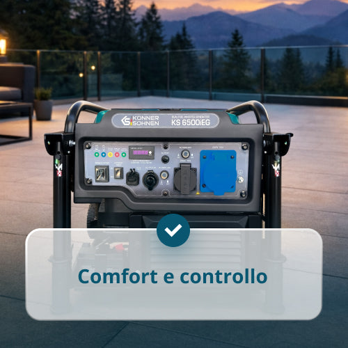 • Comfort e Controllo — Il pannello di controllo ergonomico con display LED multifunzionale ti consente di monitorare tutti i parametri del generatore. Il pannello include indicatori per il basso livello dell'olio, sovraccarico, tensione e tipo di carburante, due uscite USB, prese da 16A e 32A e un avviamento elettrico per un avvio rapido e facile del generatore, offrendo il massimo comfort.