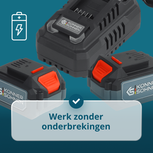 • Continu werken – twee 4,0 Ah batterijen en een 4,5 A oplader maken het mogelijk om de ene op te laden terwijl de andere in gebruik is.