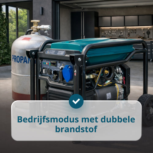 • Hoge vermogen van 6,5 kW (maximaal) en 6,0 kW (nominaal) bij gebruik op benzine zorgt voor betrouwbare stroomvoorziening voor energie-intensieve apparatuur en garandeert stabiele elektriciteit, met slechts een 10% vermogensreductie bij gebruik op gas, wat effectieve werking met minimaal prestatieverlies verzekert.