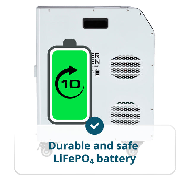 • Bateria LiFePO₄ durável e segura – vida útil até 6000 ciclos e mais de 10 anos de serviço garantem um investimento fiável na independência energética.