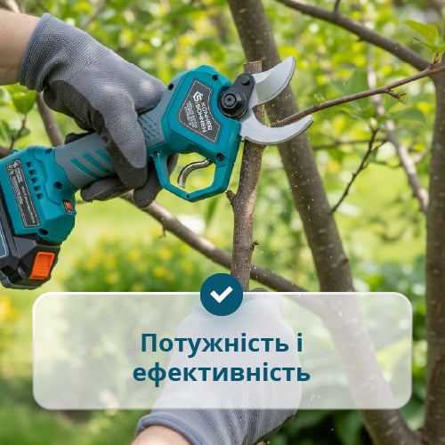 • Гнучкість у роботі — дві ширини розкриття лез (20/40 мм) дозволяють підлаштовуватись під різні діаметри гілок, економлячи час і заряд акумулятора.
